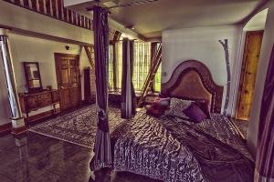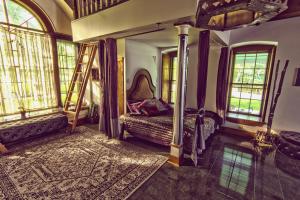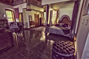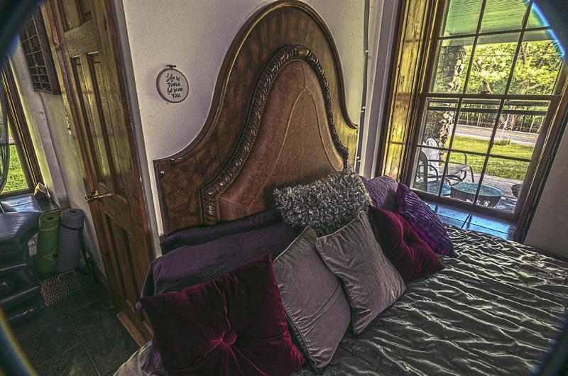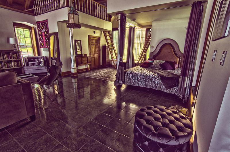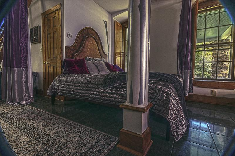 The king bed is located on the main floor of the house. Lush velvet curtains surround the bed, allowing you to swing them shut for privacy or leave them open to enjoy a full view of the room. Either way, it will feel like a treat to sleep!